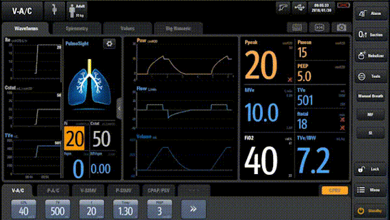 Аппарат использует цифровые и графические дисплеи для отображения сопротивления, растяжимости и состояния спонтанного дыхания в реальном времени. Благодаря возможности выведения на экран динамических кратковременных трендов, специалист может контролировать изменения в легочной вентиляции пациента и назначить соответствующее лечение.