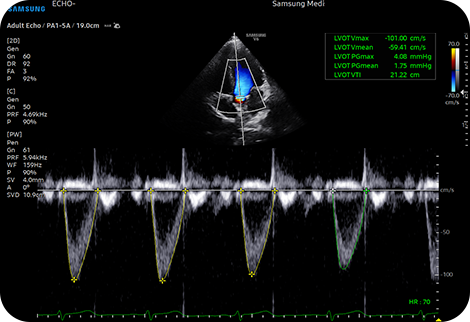 Инструмент автоматической отчетности для диагностики сердца HeartAssistTM, функция, основанная на технологии глубокого обучения, обеспечивает автоматическую классификацию ультразвукового изображения по видам измерений, необходимым для диагностики сердца, и предоставляет результаты измерений.