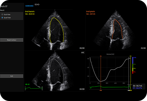 Измерение фракции выброса левого желудочка AutoEF - это функция, которая позволяет удобно измерять и количественно определять долю выброса. При выборе трех точек левого желудочка рассчитывается объем в конечной систолической и конечной диастолической точках левого желудочка, что помогает быстро и эффективно оценить функцию сердца.