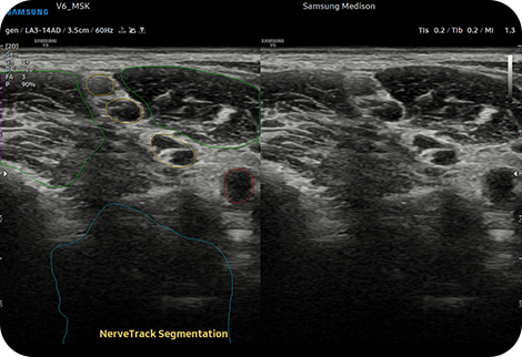 Автоматическое обнаружение нервов и отслеживание их состояния с помощью технологии искусственного интеллекта NerveTrackTM, функция, основанная на технологии глубокого обучения, определяет местоположение области нерва и предоставляет информацию о нем в режиме реального времени во время ультразвукового сканирования.