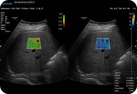 Отображение и количественная оценка жесткости тканей неинвазивным методом S-Shearwave ImagingTM позволяет проводить неинвазивную оценку состояния жестких тканей в различных областях применения. Эластограмма с цветовой маркировкой, количественные измерения, опции отображения и выбираемые пользователем функции ROI полезны для точной диагностики.