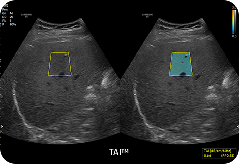 Количественное измерение жира в печени с помощью ультразвукового сигнала TAITM(визуализация ослабления тканей) обеспечивает количественное измерение ослабления тканей для оценки стеатотических изменений печени.