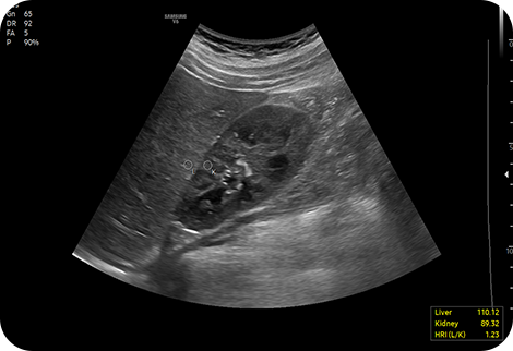 Гепато-почечный индекс с автоматизированной рекомендацией рентабельности инвестиций HRI (гепато-почечный индекс) - это показатель для количественной оценки стеатоза печени путем сравнения эхогенности паренхимы печени и коркового вещества почек. EzHRITM обеспечивает 2 ROI на паренхиме печени и корковом веществе почек и обеспечивает коэффициент HRI.
