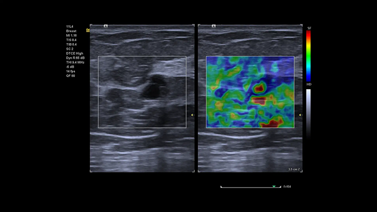 Технология качественной визуализации относительной эластичности ткани eSie Touch. Метод качественной и количественной эластографии в режиме реального времени, который позволяет вычислять и отображать на экране относительную жесткость исследуемой ткани. Метод eSie Touch дает возможность сгенерировать эластограмму за счет применения к ткани последовательных циклов мануальной компрессии во время стандартной визуализации в B-режиме.