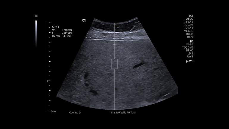 Технология качественного определения жесткости ткани в зоне интереса Point Shear Wave (pSWE). Технология точечной эластографии со сдвиговой волной позволяет получать воспроизводимую, надежную и подробную информацию о жесткости исследуемой ткани и помогает в оценке состояния, например, печени.